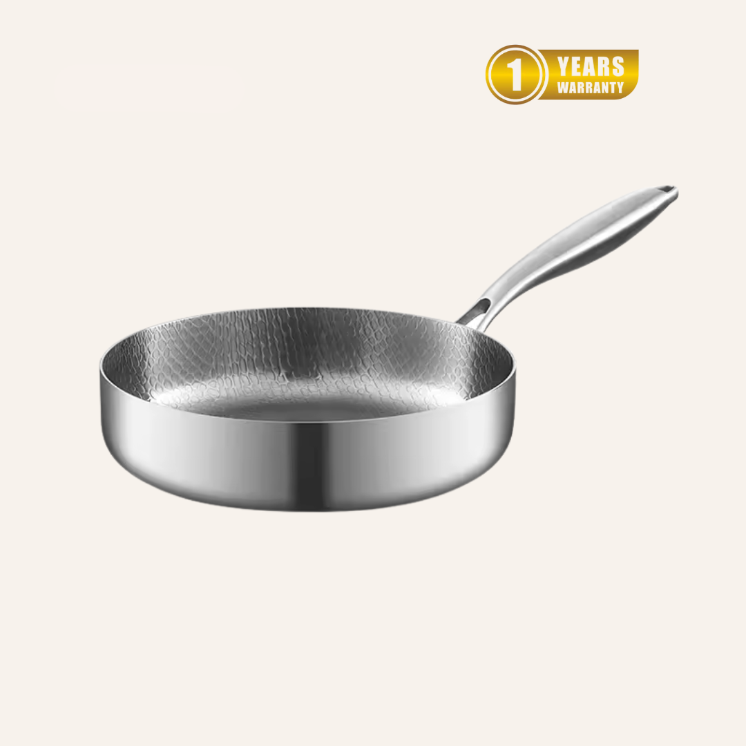 Our cookware is made from 100% pure Grade 1 titanium and finished with a hand-hammered micro-texture. This fine texture creates natural micro-valleys that minimize sticking, enhance airflow, and gradually make the surface naturally hydrophobic. Over time, this produces a genuine non-stick effect — without Teflon, coatings, or chemicals.
